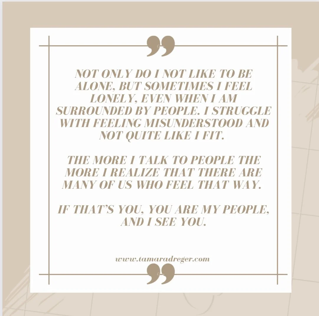 Not only do I not like to be alone, but sometimes I feel lonely, even when I am surrounded by people. I struggle with feeling misunderstood and not quite like I fit. The more I talk to people the more I realize that there are many of us who feel that way. If that’s you, you are my people, and I see you.